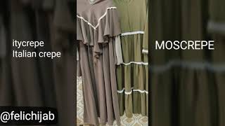 Perbedaan bahan wollycrepe dan moscrepe. Berbeda dengan bahan fleece dan bahan monalisa yang telah kita bahas sebelumnya, kain wolfis merupakan material yang terbuat 100% dari bahan polyester, bukan dari jenis katun maupun campuran dari serat katun.bahan yang memiliki tekstur halus, lembut, dan tidak membuat gerah ini, biasanya memiliki ketebalan kain dibawah bahan jersey yang menyebabkan kain ini relatif ringan dan tipis. Kami eldya store, sebagai produsen jilbab selain memperhatikan bahan, juga memperhatikan desain agar jilbab. Bahan moscrepe dan wollycrepe ini memang jadi populer untuk dijadikan gamis dan hijab muslimah. Dewasa dan anak bahan moscrepe good quality,saku mati variasi.